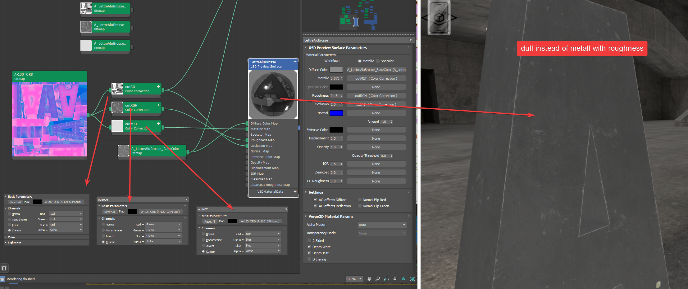 I have made one myself with photoshop, and i use a “colorCorrection” to split this bitmap in Occlusion / roughness / metallic, like explained in the manual (red/red/red/alpha, g/g/g/a and b/b/b/a), but when i export the render is not good : roughness is dull, like if it was full white.