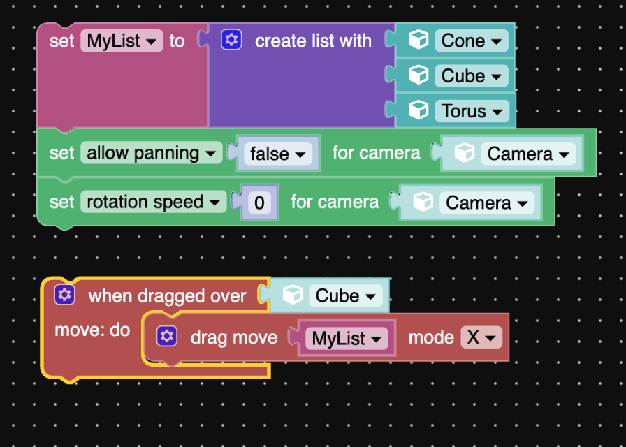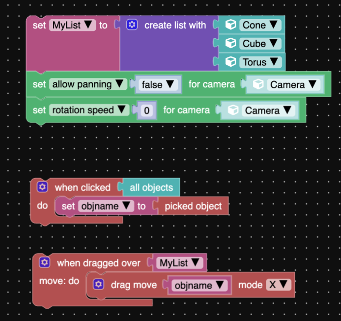 When placed in a “When dragged over” puzzle…you can control which object in the list you want to be clicked on to drag the items in the list or you can set the When Dragged Over puzzle to take action on your list so that any item in your list can drag your list of objects.
