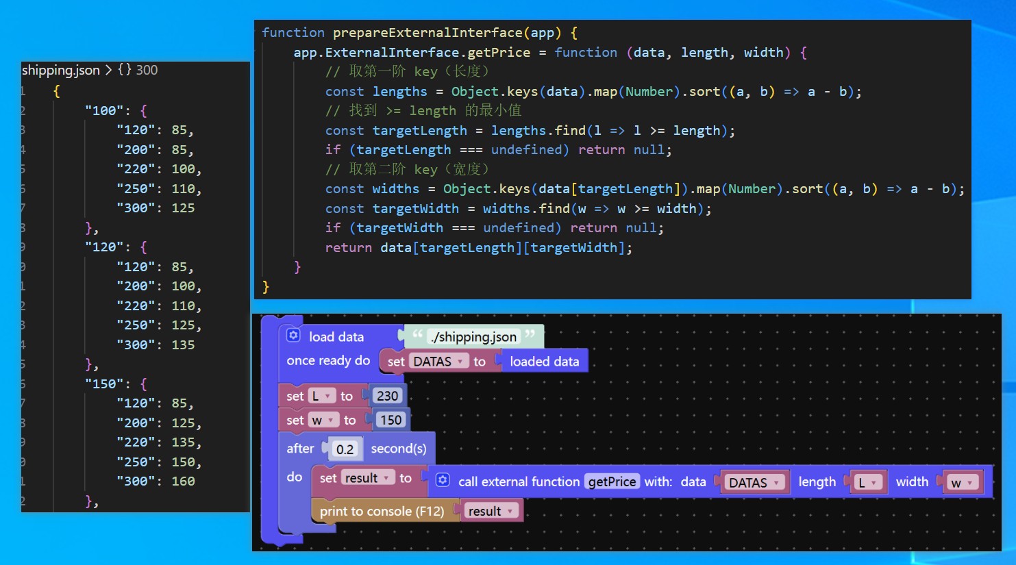 The thing is that I need the keys to be flexible. When the user selects a certain size (both width and height), it should automatically use the JSON as a look-up table and get the proper value. That’s the context for this file, and that is why I’ve ordered it this way.When I print the loaded data and in dict get key they do show up. But when I try to get to a key within the key, it seems not to work. Some additional information would be appreciated :) Thanks in advance