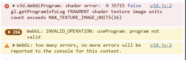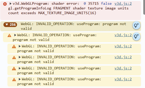 v3d.js:2 v3d.WebGLProgram: shader error: 0 35715 false gl.getProgramInfoLog FRAGMENT shader texture image units count exceeds MAX_TEXTURE_IMAGE_UNITS(16)