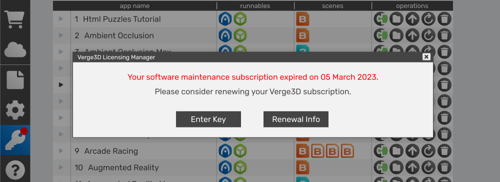 Pay attention, that using a newer version (not covered by your subscription time span) can result in various nasty technical issues, because the App Manager is designed not to touch the old Verge3D runtime which is activated by an outdated key. Basically, you'll get and old Verge3D coupled with up-to-date App Manager, Puzzles, and exporters (which is really bad!).